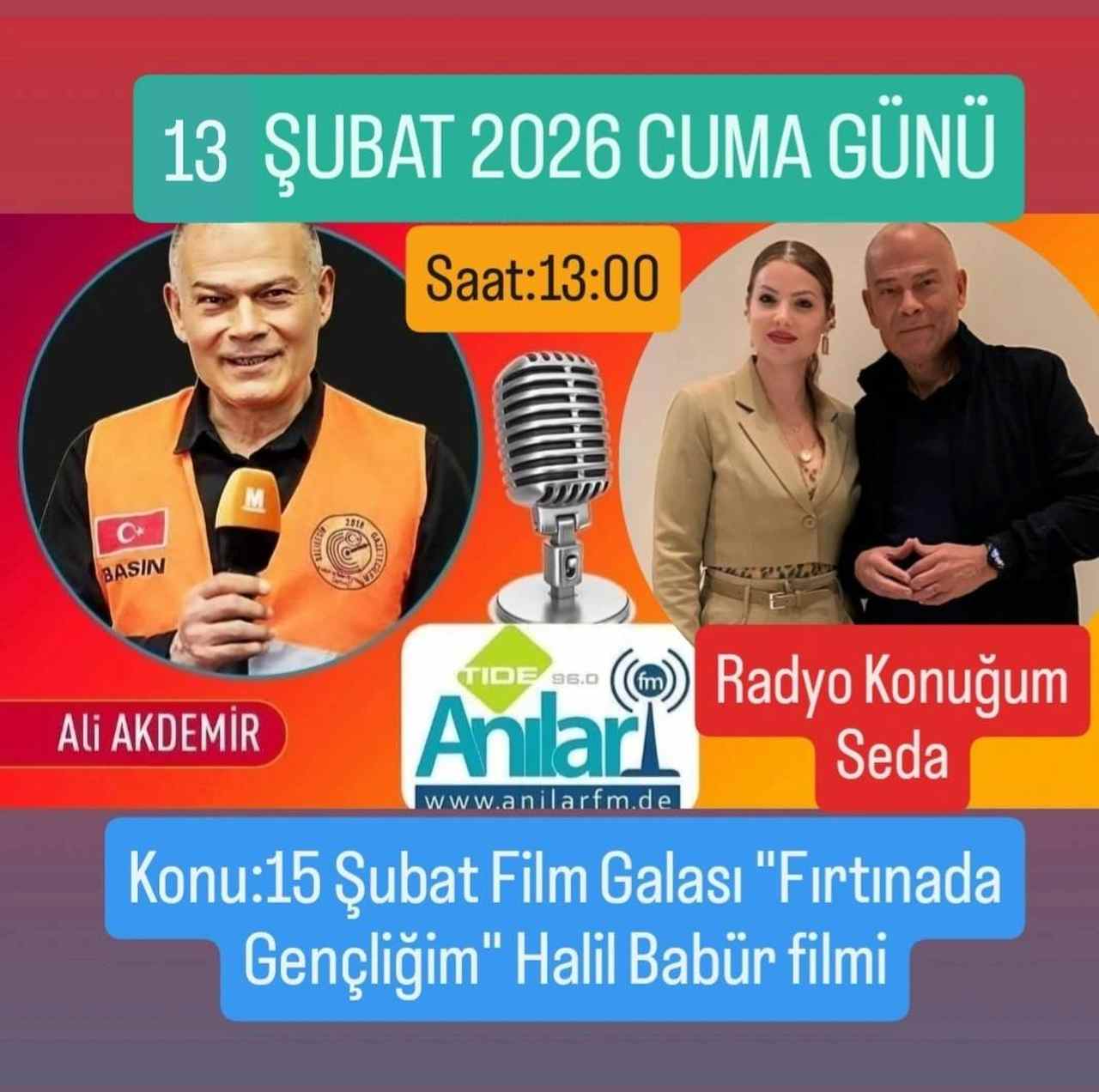 13 Şubat 2026 Cuma günü ANILAR FM’de sinema ve gençlik temalı özel bir yayın dinleyicilerle buluşacak. Almanya saatiyle 13.00–14.00, Türkiye saatiyle ise 15.00–16.00 arasında gerçekleşecek programda, yapımcılığını Halil Babür’ün üstlendiği “Fırtınada Gençliğim” filmi ele alınacak.