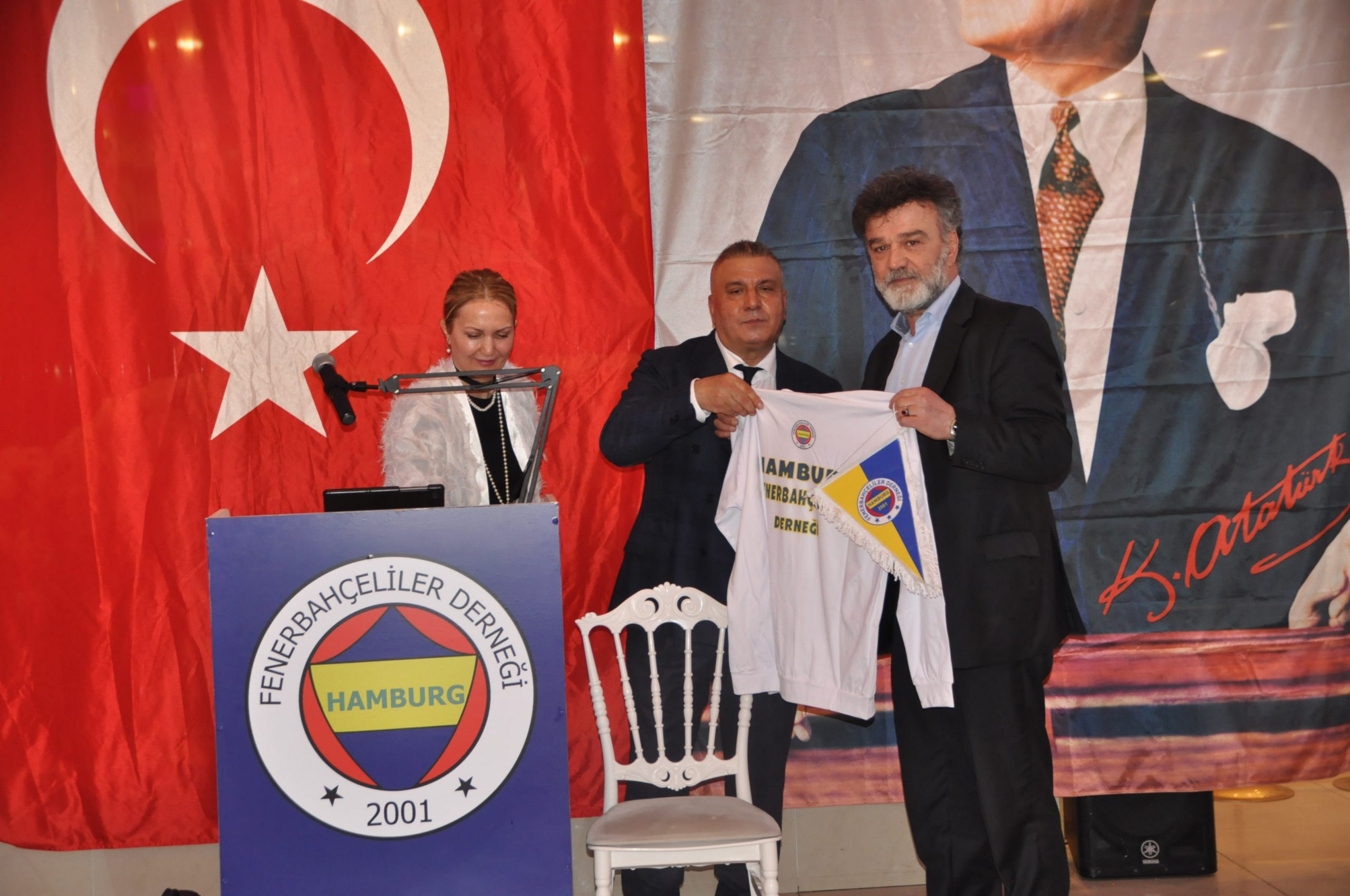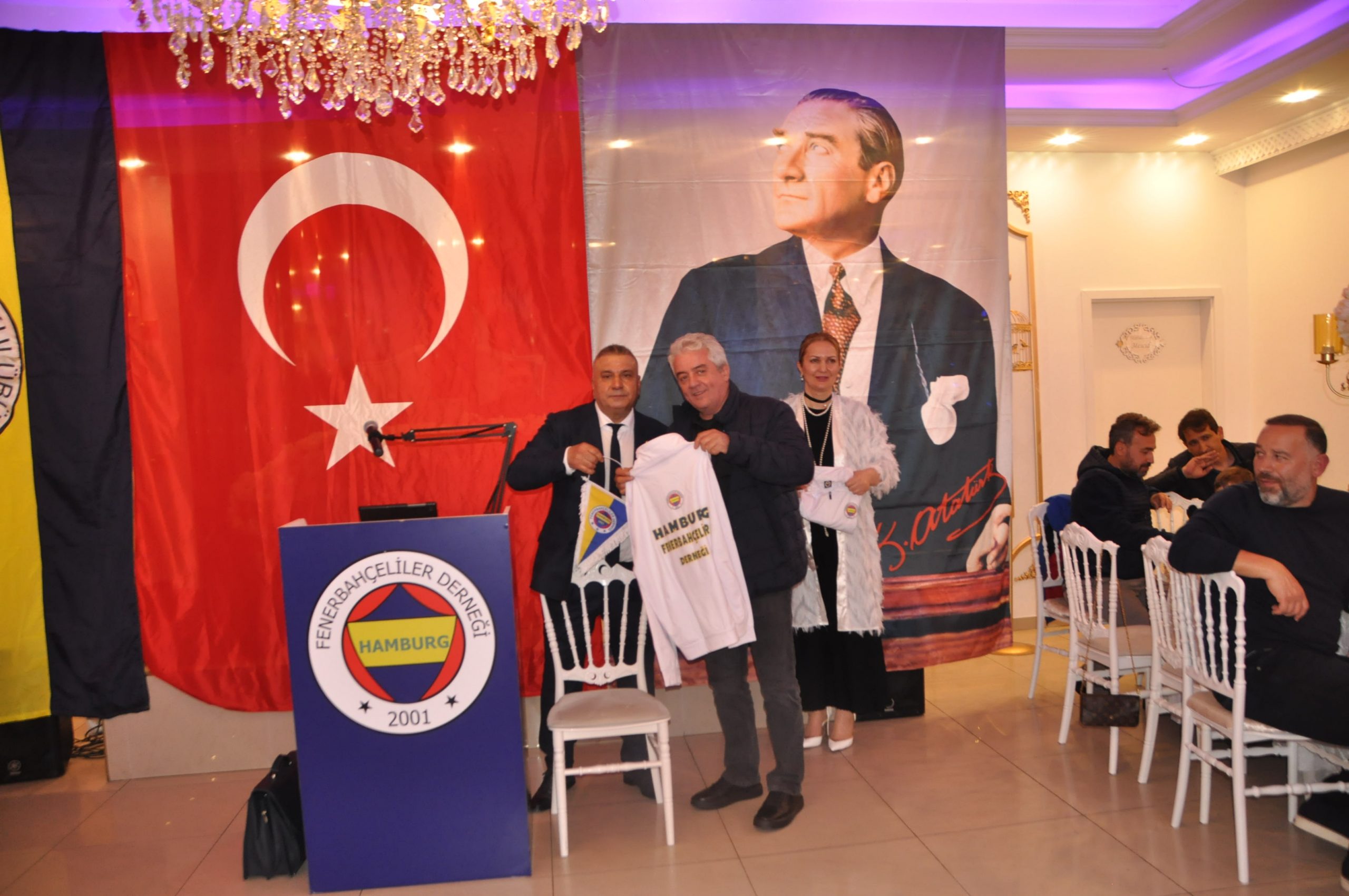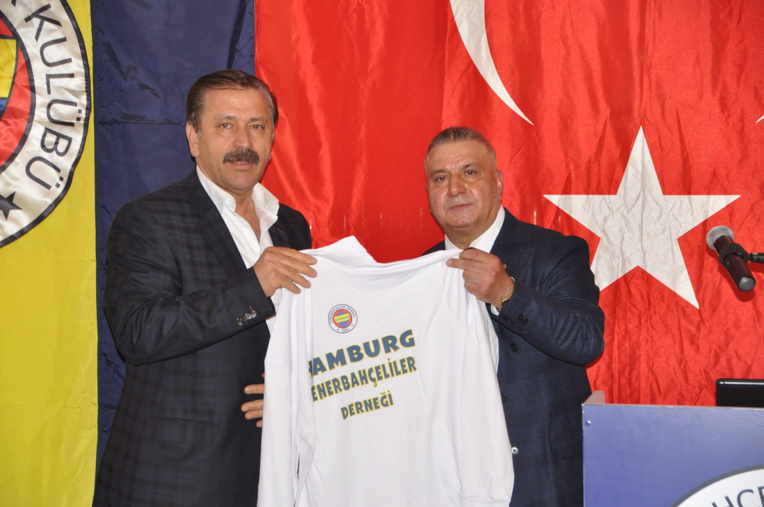 Sosyal sorumluluk projesi kapsamında ” Çocuklarımız Üşümesin”Erzincan bölgesinde yaşayan çocuklar için giyim ve kıyafet yardımında bulunan dernek yöneticileri ve iş insanlarına Hamburg Fenerbahçe Derneği’nin logosu olan formalar ve eşorfmanlar başkan Mustafa Çömlek tarafından sahneye takdim edildi.